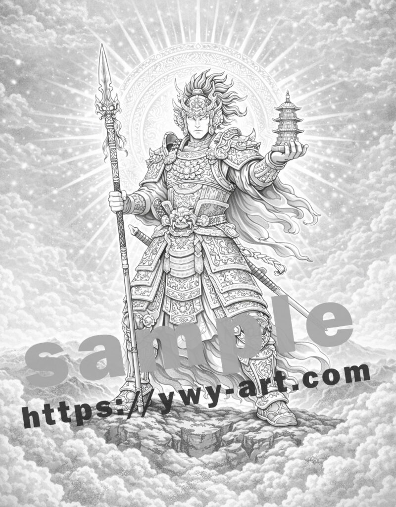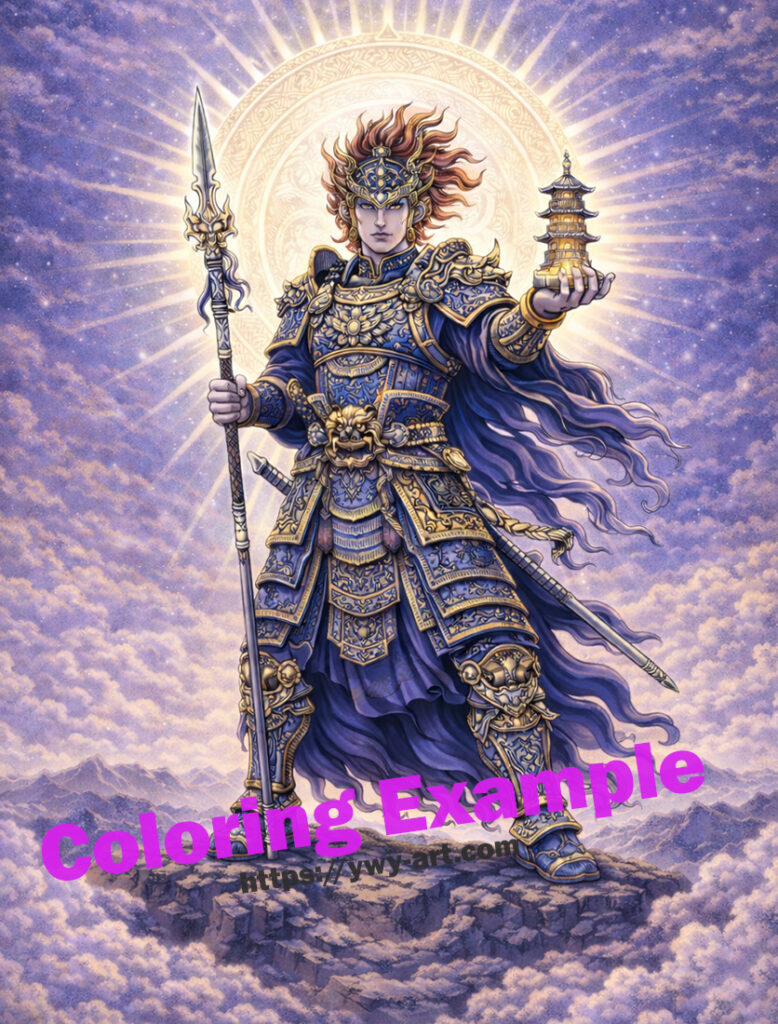 精緻なタトゥー調ラインで描かれた本作は、鎧の装飾、神聖な象徴、流れる衣、そして天上の光を強調しています。金属的な色彩表現や重厚な影、空気感のあるコントラストを楽しめる構成で、塗り手の表現力を存分に引き出します。伝統的な濃紺と金で格調高く仕上げることも、現代的な大胆な配色で再解釈することも可能です。