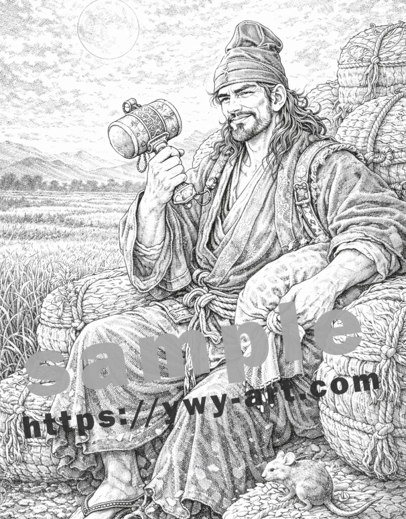 In this illustration, the powerful god appears with a confident yet welcoming presence, surrounded by traditional motifs that emphasize abundance and fortune. The composition balances strong character design with open areas that make the image enjoyable and accessible for coloring.