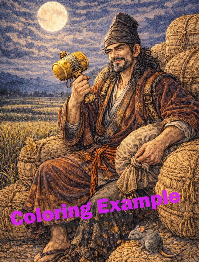 このイラストでは、堂々とした存在感を持つ大黒天が 豊穣や幸運を象徴するモチーフに囲まれて描かれています。 キャラクターの力強さを保ちながらも、 塗り絵として楽しめるよう広い塗りスペースを確保した構図になっています。