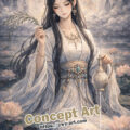 このイラストでは、ダヌは創造の流れを秘めた静かな女神として描かれています。手の中で渦を巻く水は、誕生、変化、再生という生命の循環を象徴しています。