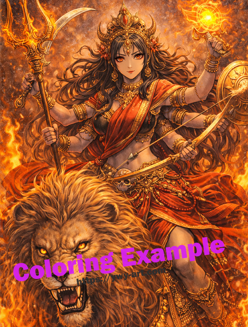 Her garments are traditionally depicted in deep reds, golds, and warm tones, symbolizing strength, energy, and divine power. The jewelry and ornaments can be colored with metallic tones such as gold, bronze, or copper to emphasize her royal and divine status.