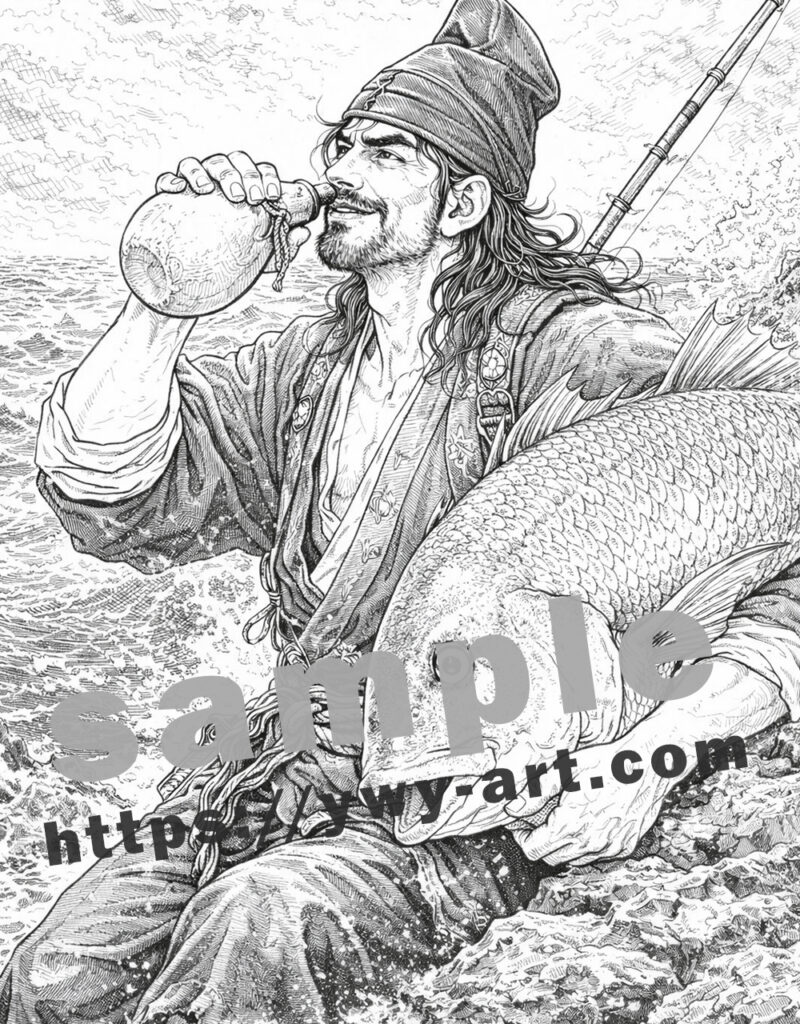 The dynamic waves, rocky shore, and detailed scales of the sea bream create a rich and enjoyable coloring experience while capturing the spirit of Japan’s fisherman god.