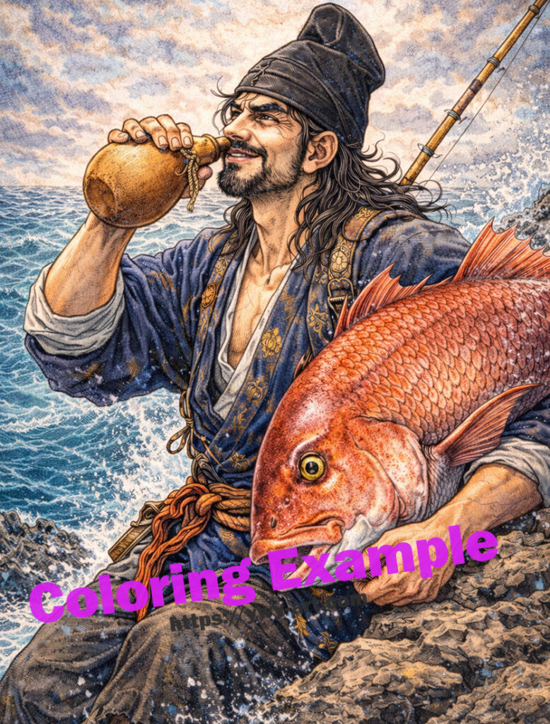 背後では波が岩に打ち寄せ、海の厳しさと恵みの両方を象徴しています。うねる波や岩場、そして鯛の細かな鱗など、多くの彩色要素があり、塗り絵としても豊かな表現を楽しめる作品となっています。