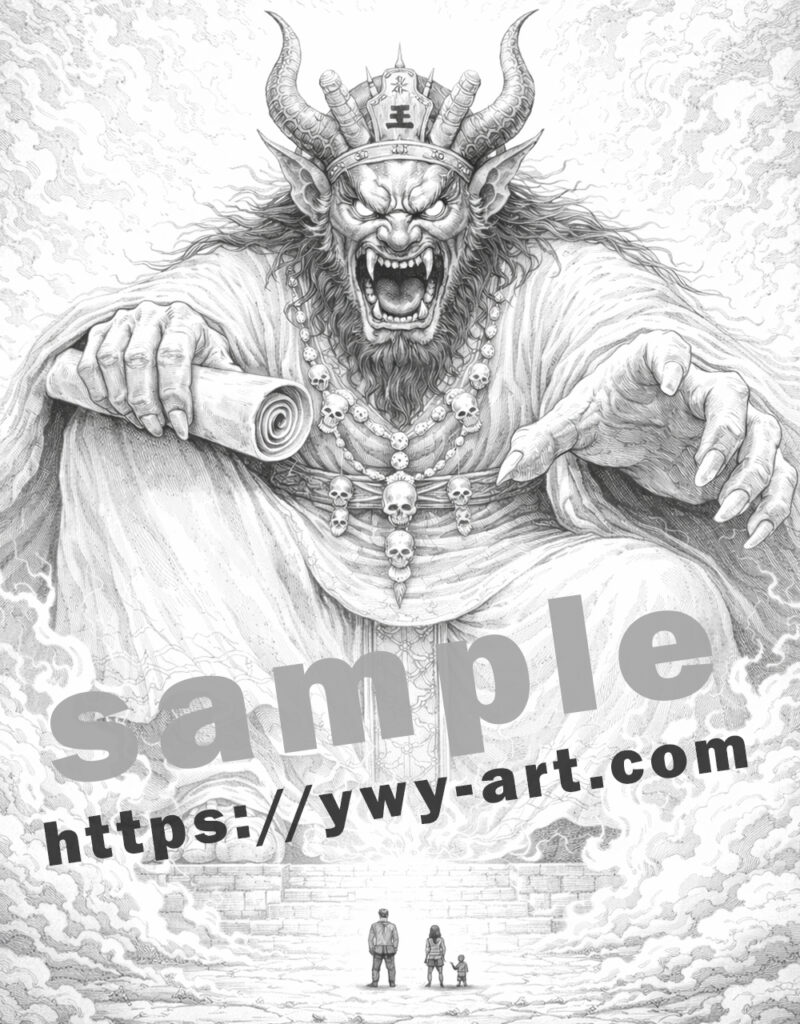 この作品では、閻魔は人間を遥かに超えた巨大な存在として描かれ、 圧倒的な威圧感を放ちながら玉座に座しています。 まるで世界そのものが彼の支配下にあるかのような構図となっています。