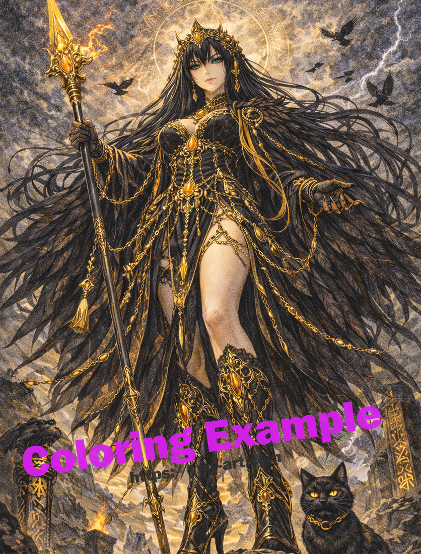 今回の塗り絵では、フレイヤをただ美しいだけの幻想的なヒロインとしてではなく、人間の世界を見下ろすような高位の神として描いています。低い視点から見上げる構図によって、その存在は大きく、静かで、近寄りがたいものとして表現されています。黒い羽のように広がるマント、複雑に重なる黄金の装飾、神聖な槍、そして黒を基調とした装いが、彼女の美しさと支配的な気配を同時に引き立てています。