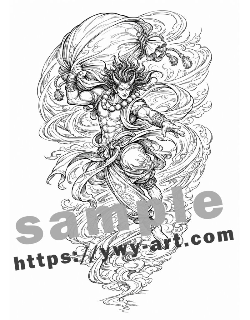 In this illustration, Fujin moves dynamically through swirling winds, his form blending with the currents he controls. The flowing composition emphasizes motion and continuity, creating a sense of constant movement across the entire piece.