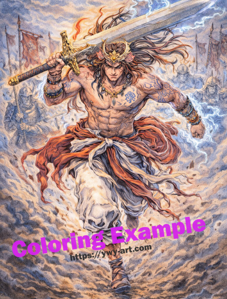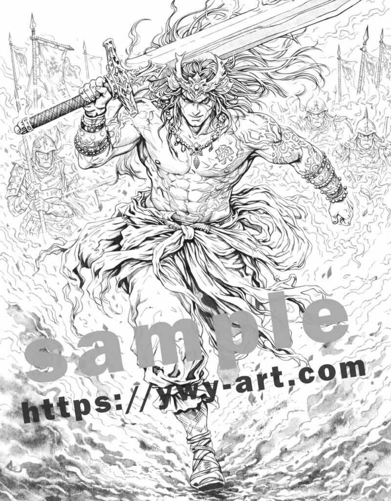激しく動く構図と迫力ある表現の中にも塗りやすい空間が残されており、武神の力強さと戦場の雰囲気を自由な色彩で表現することができます。