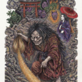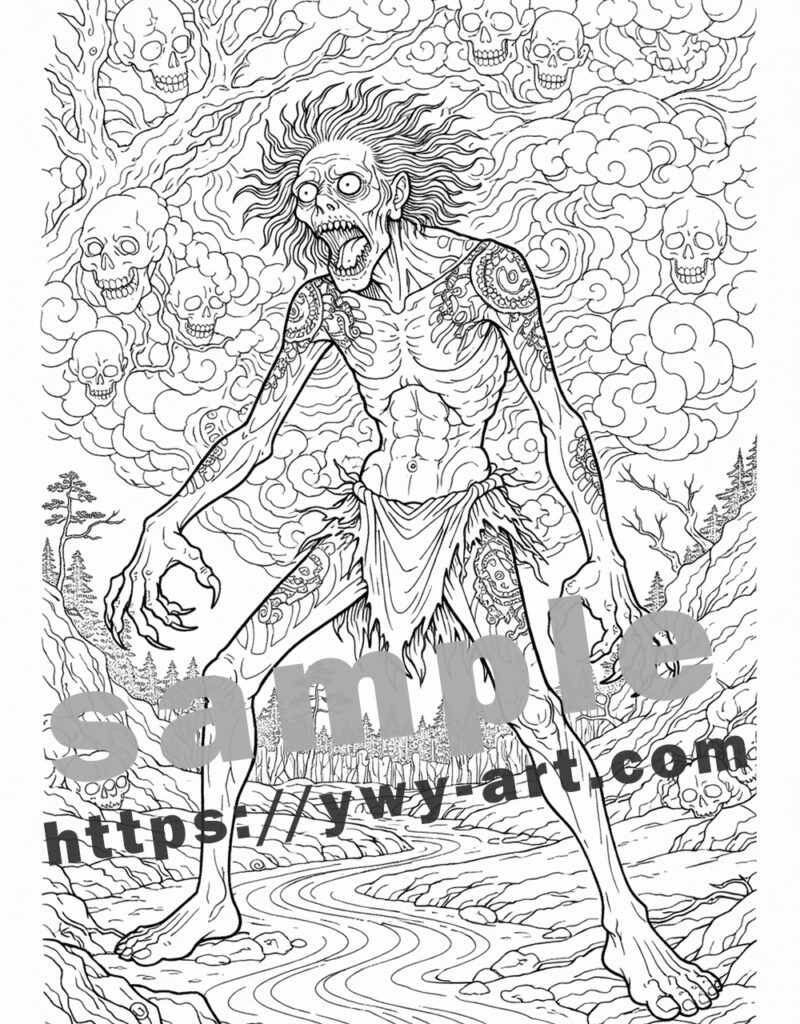 骨ばった身体、流れる雲、重なる霊の存在が、強い世界観を生み出しています。空虚と迫力、影と存在感のコントラストを楽しみながら塗ることができます。
