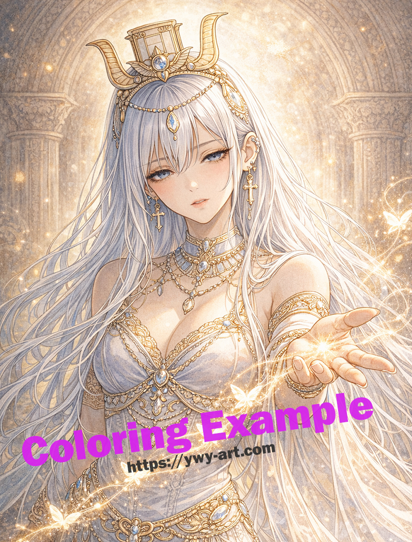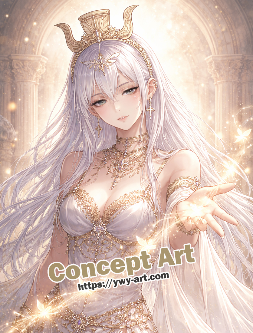 衣装は薄いグレーや青みのあるグレー、アイボリー系と相性が良く、装飾には金や淡いシャンパンゴールドを使うと神聖さが引き立ちます。魂の光は白を残しながら、周囲にごく薄い黄色や金色を入れると自然な発光感を出せます。