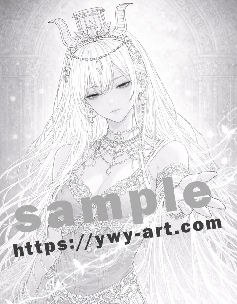 本作では、ネフティスが魂を導く一瞬を、穏やかな緊張感の中で表現しています。少し伏せた視線と差し出された手によって、彼女が支配するのではなく、静かに道を示していることが伝わります。