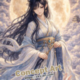 背景にある建築的な要素は、現実の場所というより、現世と来世のあいだにある儀式的な空間を示しています。そのため全体として、静けさの中に意味が宿る構図になっています。