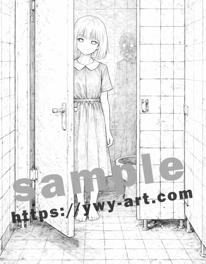 花子さんは、学校のトイレの「三番目の個室」に現れると言われる存在です。 短いボブヘアにシンプルな服を着た少女の姿で、 ただ静かにそこにいるとされています。