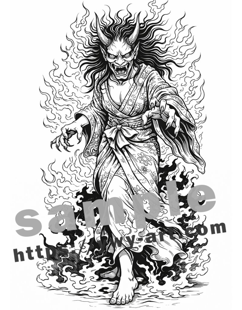 本作品では、炎に包まれながら迫り来る般若を描いています。流れるような線と和彫りを意識した構図が、感情の激しさと動きを強調し、見る者に強い印象を与えます。