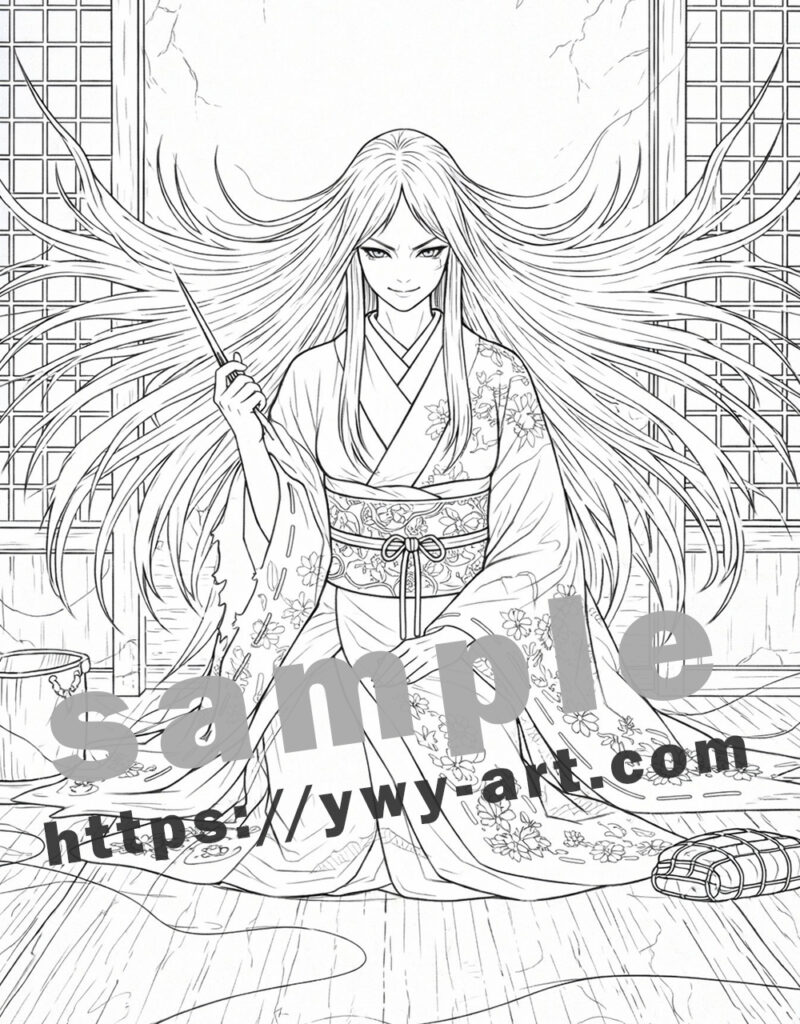 Designed for coloring, the artwork combines open areas with intricate details in the hair and kimono patterns. This balance allows for both relaxed coloring and detailed expression, offering a quiet yet immersive experience.