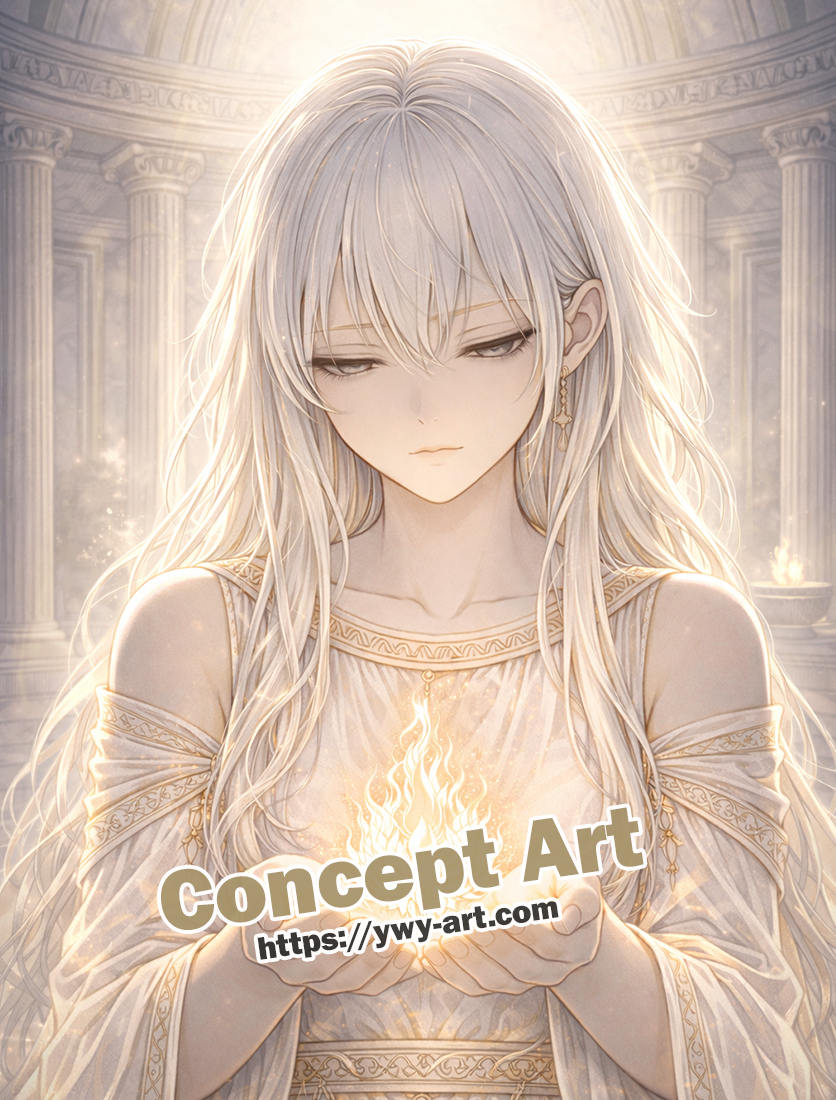 Facial expression should remain neutral and composed. Avoid exaggerated emotion, as her strength comes from consistency rather than reaction. The lighting should be soft and stable, emphasizing the contained nature of the flame and the stillness of the environment.