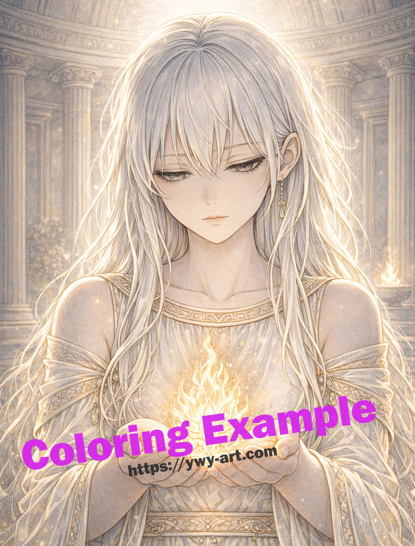 塗りでは炎を主役として扱い、周囲は控えめな色でまとめるとバランスが取りやすい。暖色系をベースにしつつも、グラデーションを丁寧に使うことで神聖さと落ち着きを同時に表現できる。