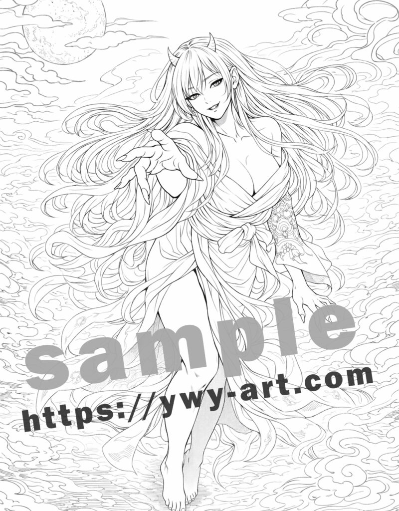 塗り絵としては、広い余白と流れるようなディテールのバランスを重視しています。 雲や髪、布の動きに沿って色を重ねることで、 やわらかさと奥行きのある表現を楽しむことができます。