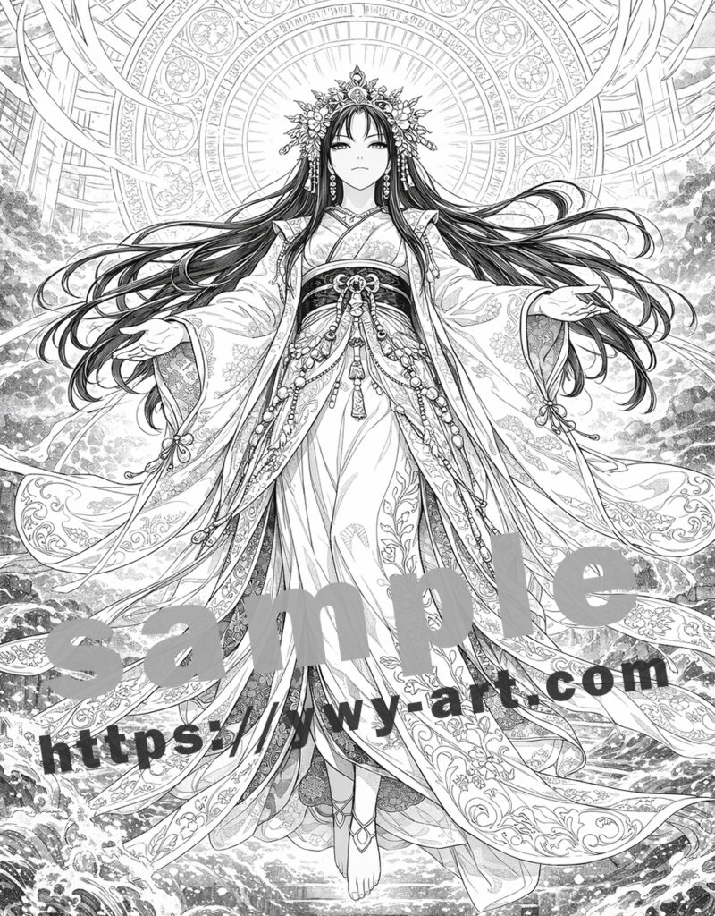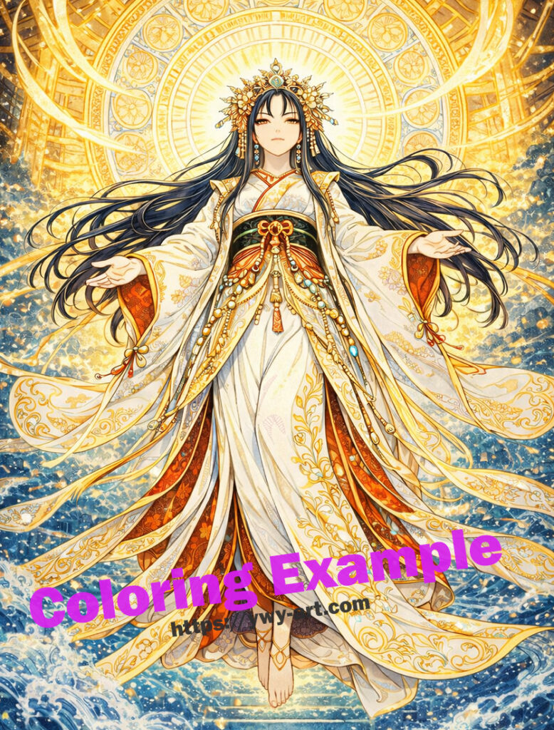 このイラストでは、卑弥呼を神秘的で威厳ある巫女王として描いています。 背後に広がる神聖な円は宇宙の秩序や神の力を象徴し、 流れるような衣装や装飾、波の表現は霊的な力と古代世界の雰囲気を 同時に表現しています。 細かな装飾と広い余白が、塗り絵としても楽しめる構成になっています。