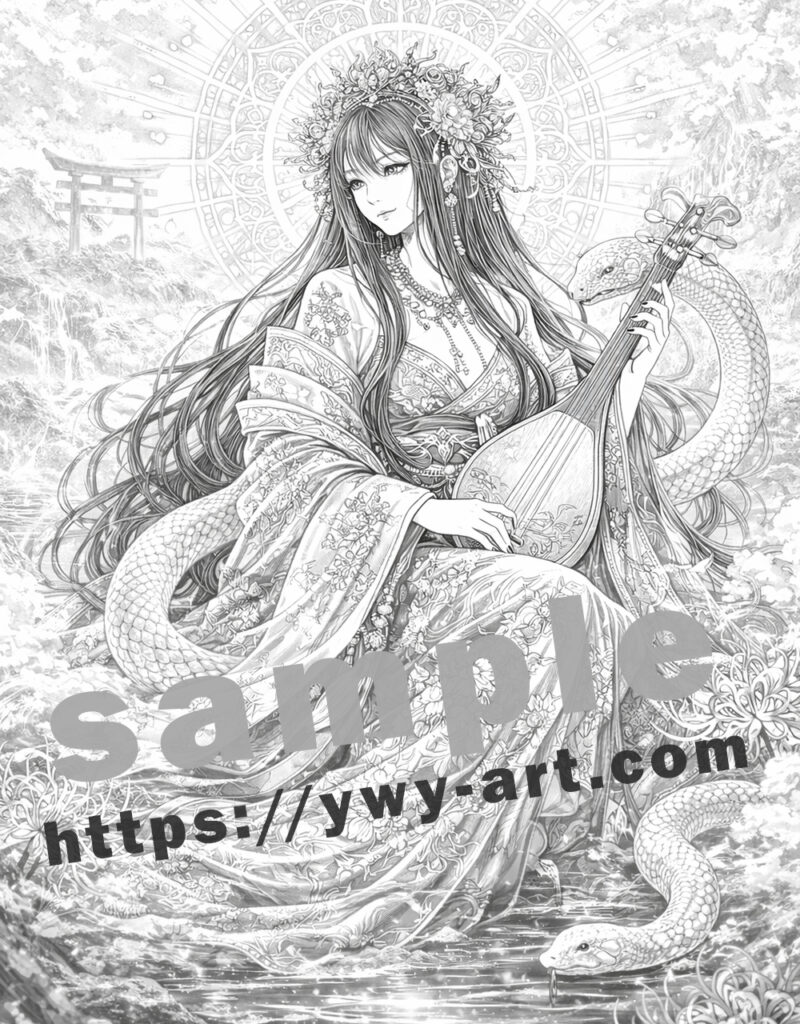 このイラストでは、市杵島姫は水辺に静かに座り、琵琶を奏でています。水面には穏やかな波紋が広がり、自然の静かなリズムを表しています。背後には神聖な光輪が広がり、神の存在と神秘的な力を象徴しています。