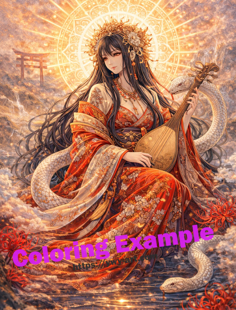 In this illustration, the goddess sits gracefully beside flowing water while playing her biwa. Gentle ripples spread across the surface, reflecting the calm rhythm of nature. Behind her, a radiant sacred halo spreads like sunlight, expressing divine presence and spiritual power.
