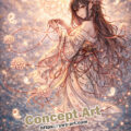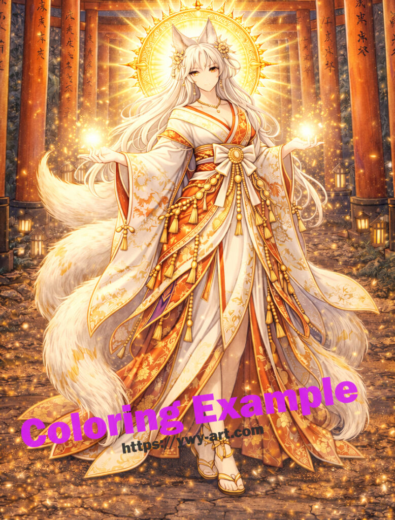 このイラストでは、神聖な鳥居の参道に立つ優雅な女神として稲荷神が描かれています。 周囲に広がる狐の尾や神秘的な光は、 神の力と霊的な世界の存在を象徴しています。