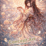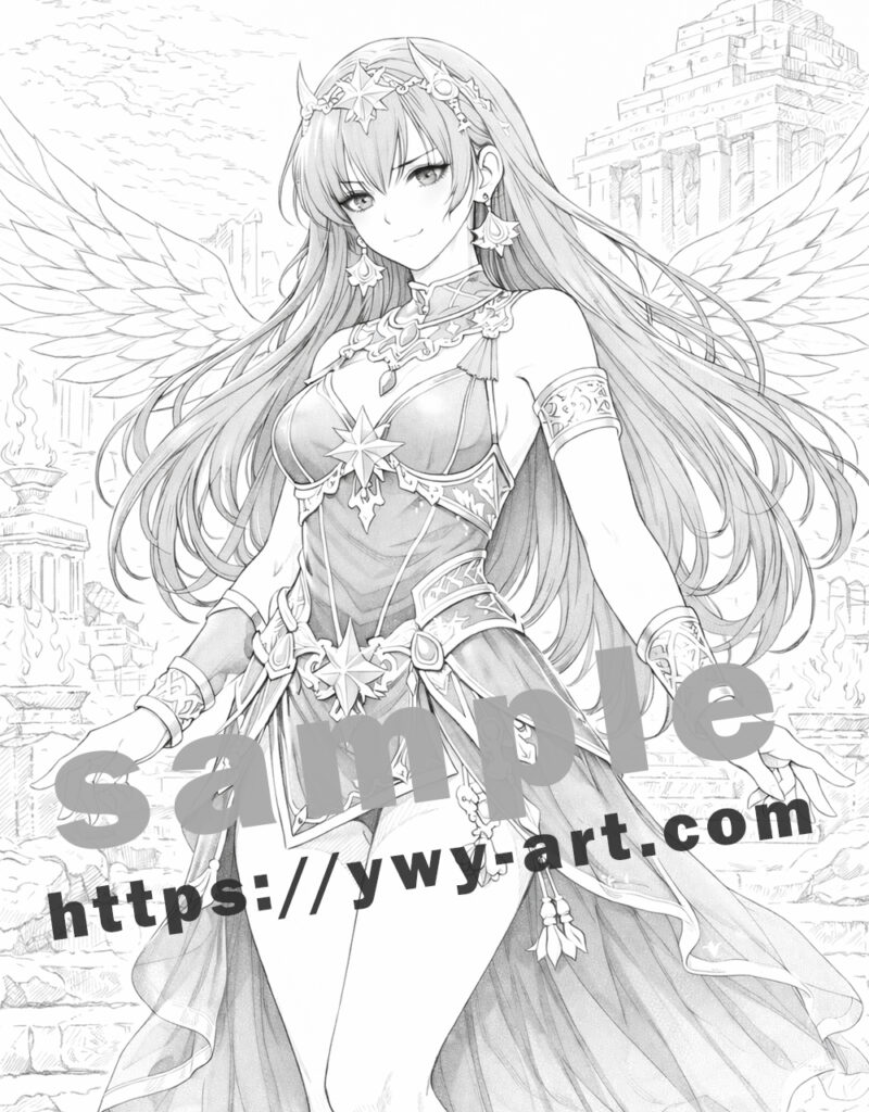 The flowing ornaments, layered garments, and intricate jewelry create elegant shapes and patterns, offering a rich and immersive coloring experience.