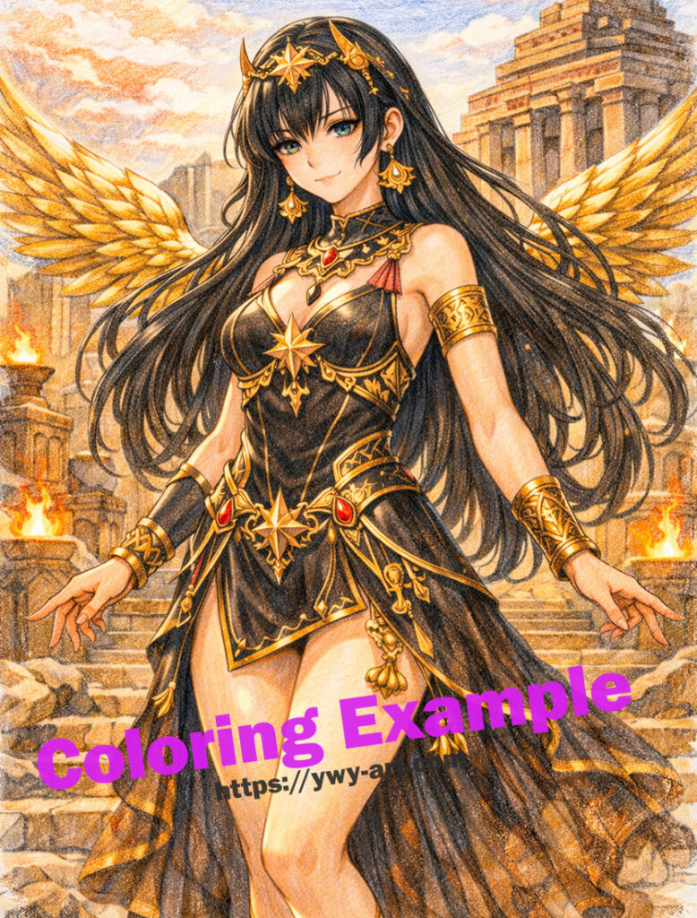 In this illustration, Ishtar appears before the ruins of an ancient Babylonian temple, her golden wings shining behind her like a divine emblem of power.