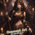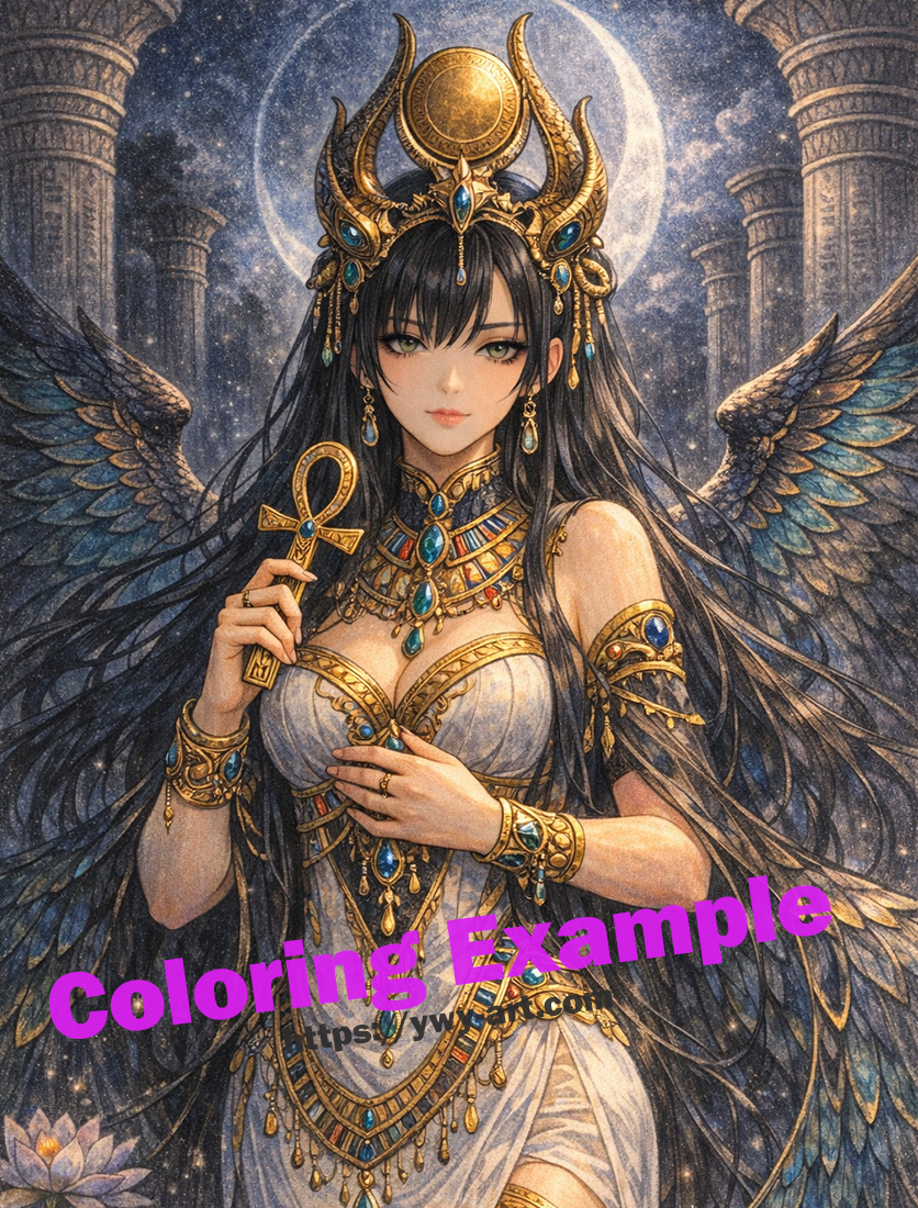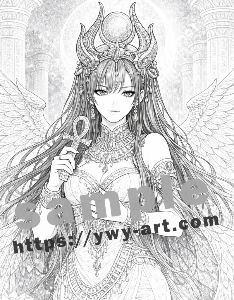 精巧な装飾、流れるような髪、幾重にも重なる羽など、古代エジプトの象徴とダークファンタジーの美しさを融合させた構図となっており、塗り絵としても多彩な表現を楽しむことができます。