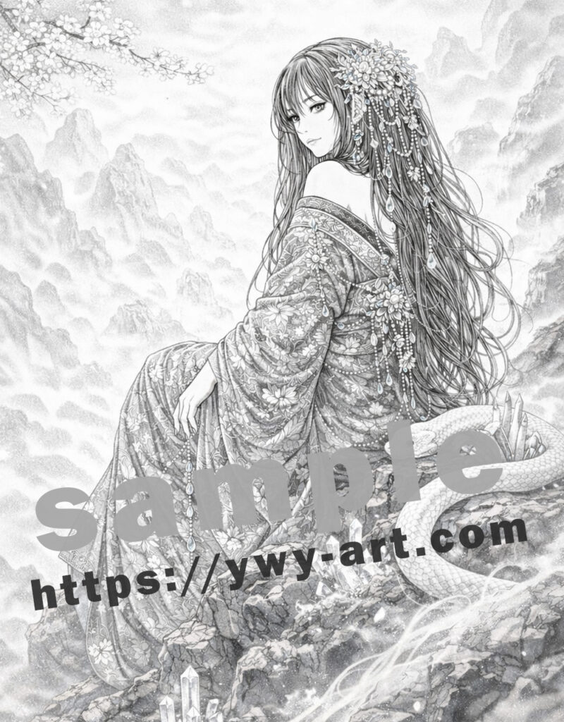 このイラストでは、磐長姫は山深い岩の上に静かに座り、周囲には霧と水晶が漂っています。静かな表情の奥には、大地そのもののような永遠の力が宿っています。