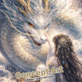 In this illustration, Iwanagahime sits quietly upon ancient rocks high in the mountains. Mist drifts across the landscape, and crystal formations emerge from the stone around her, symbolizing the timeless power hidden within the earth.