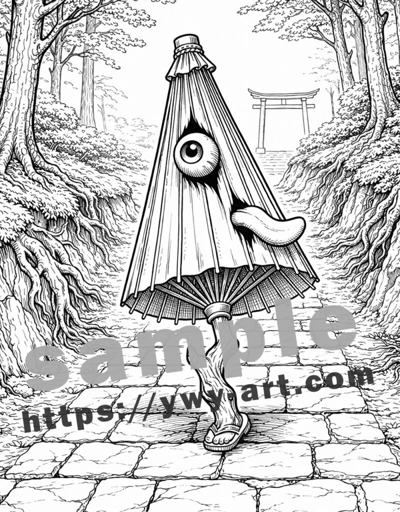 Karakasa Obake is not a creature of chaos, but of quiet presence. As you color, imagine the stillness of the path, the sound of a single step, and the gentle awareness of something watching from the shadows.