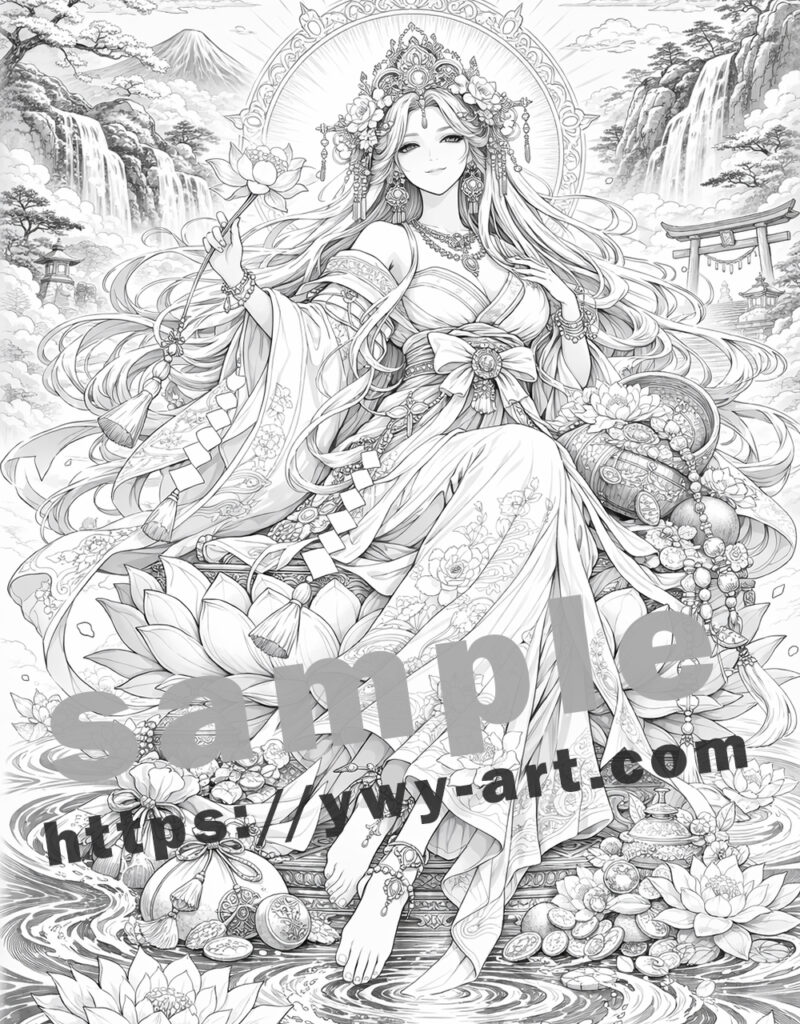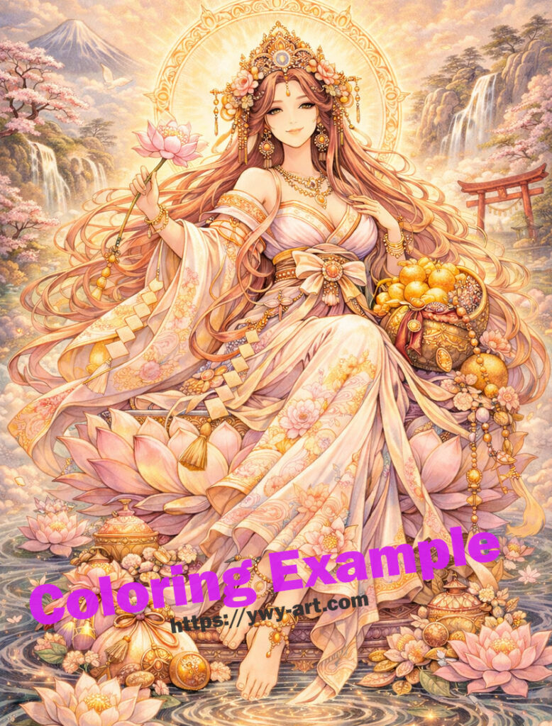 繊細な装飾や衣装を自由に彩りながら、 美と豊かさを象徴する女神の世界観を楽しむことができる塗り絵作品となっています。