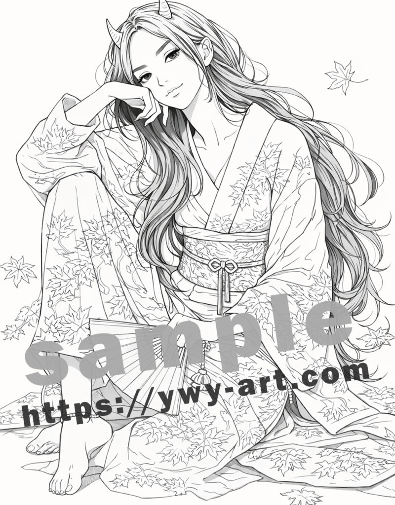 Designed for coloring, the artwork offers a balance between open space and intricate detail. The kimono patterns, hair flow, and surrounding leaves provide depth and variety, allowing for both soft, harmonious coloring and more dramatic expression.