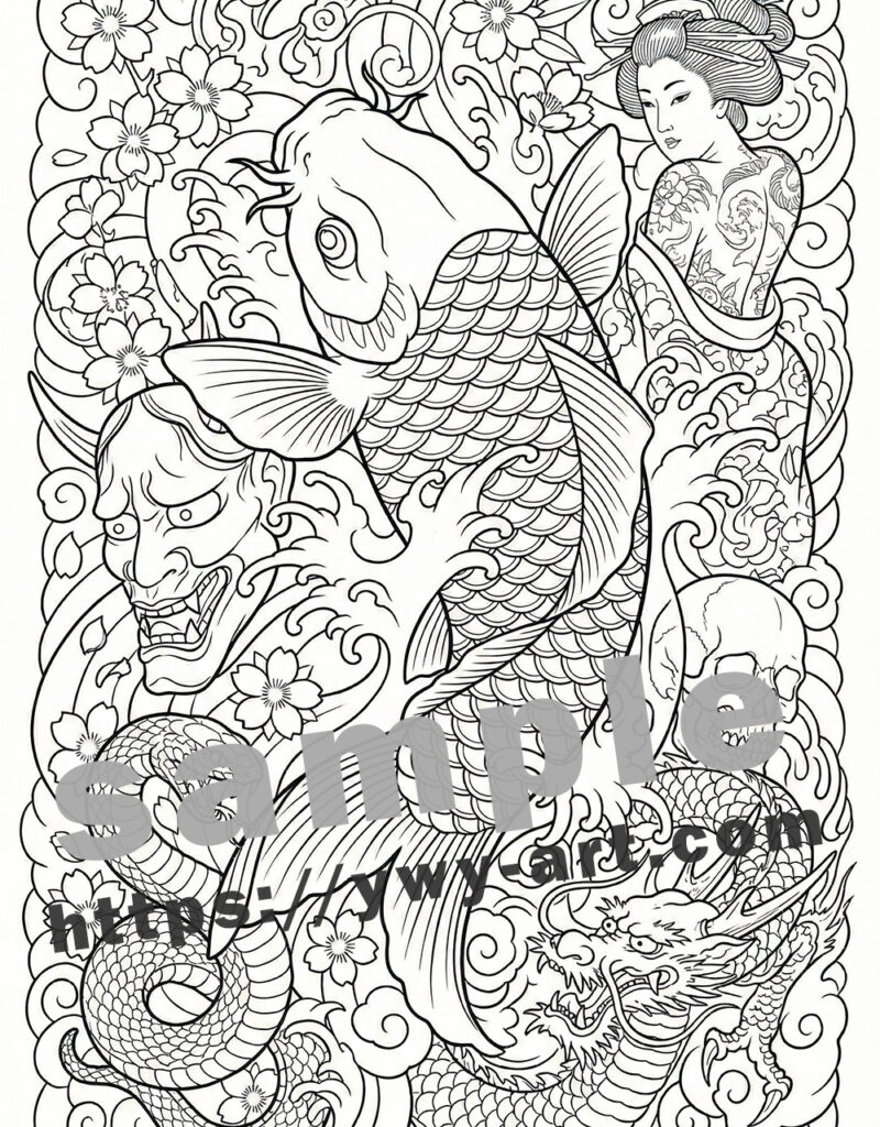 • Traditional Japanese motifs including oni, dragons, and cherry blossoms