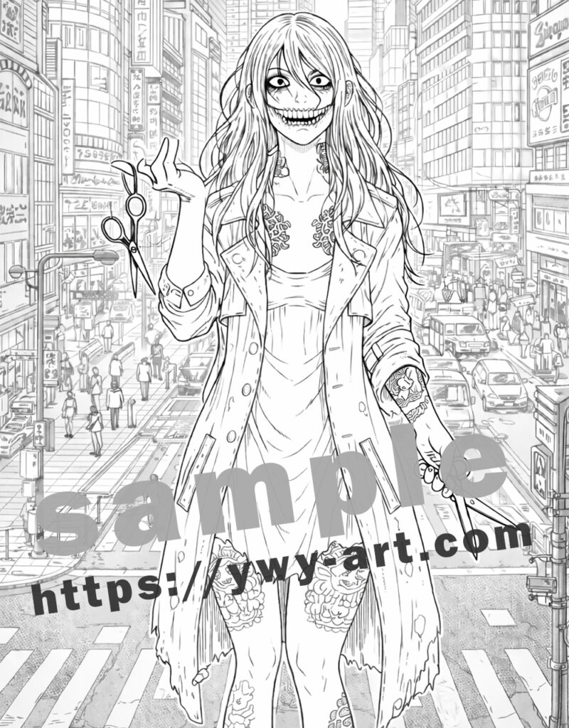 Her smile stretches unnaturally wide, revealing a grotesque, split mouth that distorts her beauty into something terrifying. In her hands, she carries a pair of scissors, reflecting the city lights as she moves silently through the crowd.