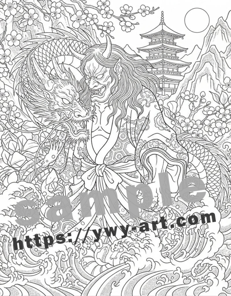 The confrontation between the oni and the dragon is more than a battle—it is a symbolic representation of inner conflict and balance. This artwork invites viewers to explore both the beauty and intensity of these opposing forces.