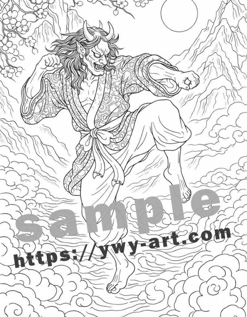 Oni are often associated with natural forces such as storms, mountains, and violent weather. In this illustration, the rugged terrain and swirling clouds emphasize the connection between the oni and the wild, untamed world.