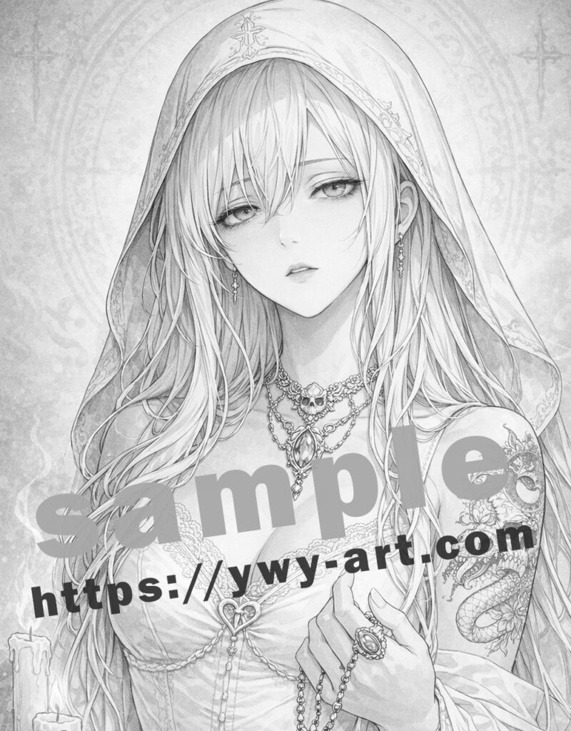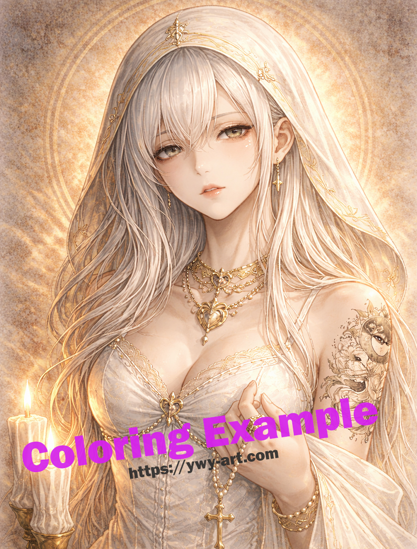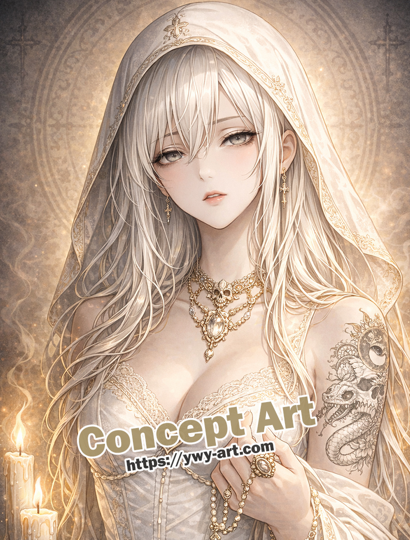 | Visual Keywords | White veil, skull motif, rosary, candlelight, sacred aura |