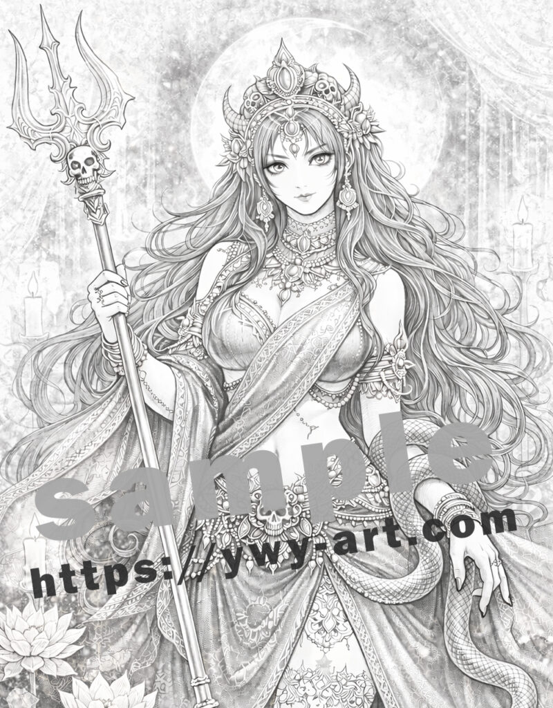 In this illustration, Parvati appears beneath a glowing moon, surrounded by symbols connected to Shiva and the mysteries of the universe. The trident, sacred ornaments, flowing garments, and serpent motifs create intricate details that invite careful coloring and creative interpretation.