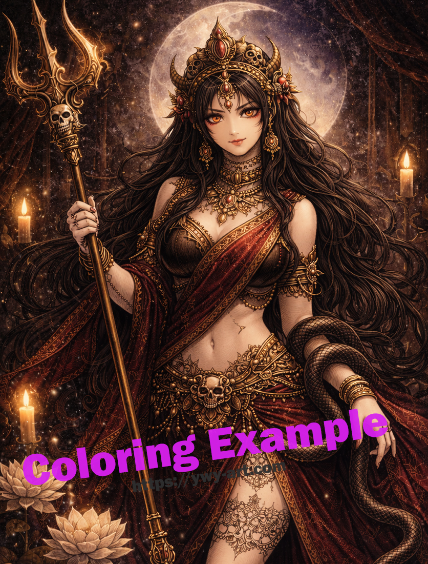 Her garments can be colored in rich tones such as deep crimson, burgundy, or dark violet, colors often associated with divine femininity and mystical power. Gold accents work well for her jewelry and ornaments, emphasizing her divine status and adding brilliance to the design.