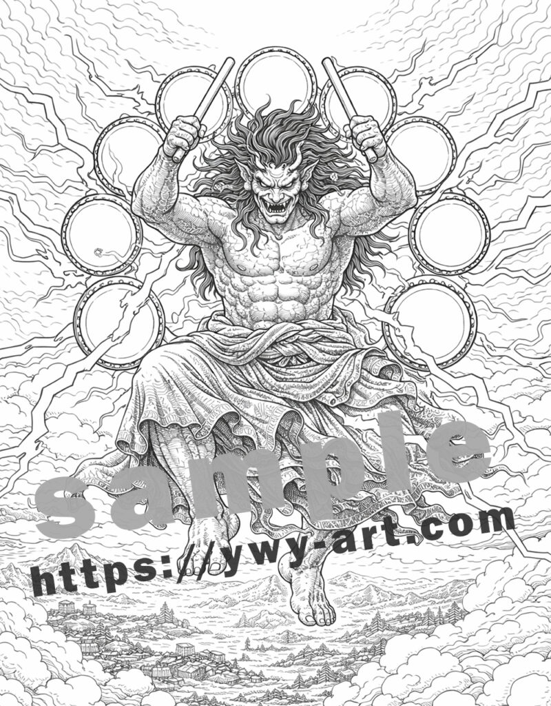 Raijin is the Japanese god of thunder, a powerful and fearsome deity who commands storms and lightning. Surrounded by drums that echo across the heavens, he creates thunder with each strike, shaking the earth below.