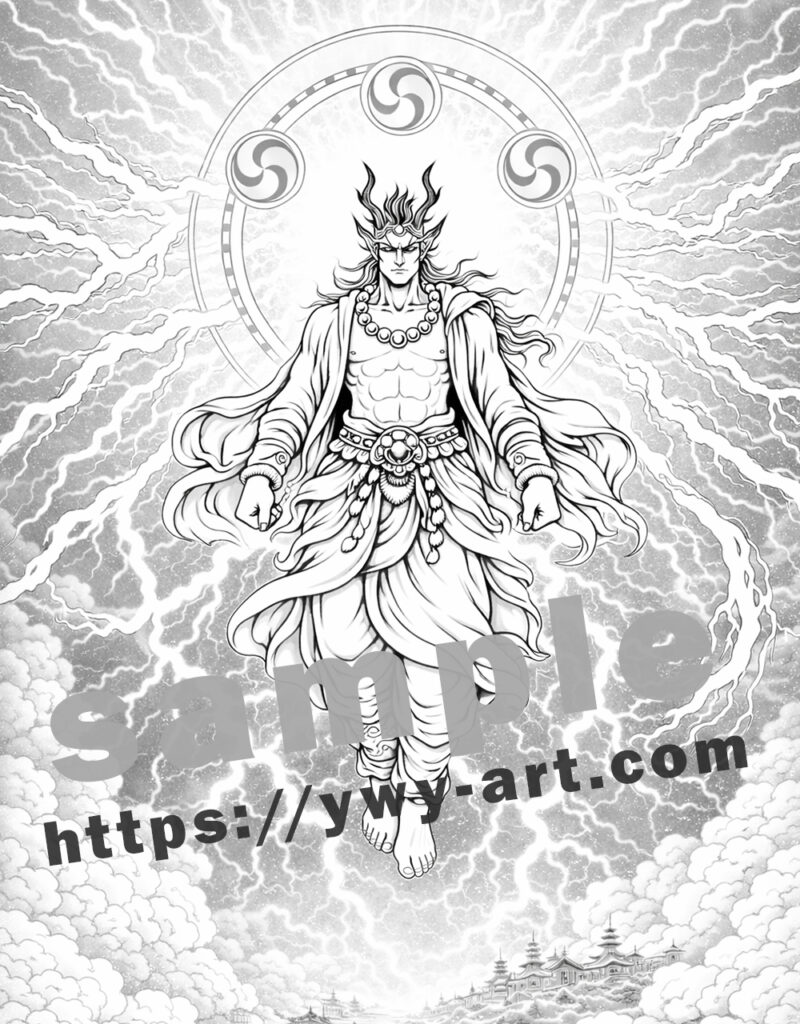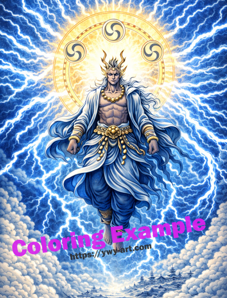 Designed for advanced colorists, this illustration features intricate cloud formations, layered lightning patterns, and symbolic detailing that invite depth, contrast, and dramatic lighting exploration. Whether you choose deep indigo skies, radiant gold halos, or cold white-blue lightning, Raijin becomes a canvas for controlled intensity and spiritual atmosphere.