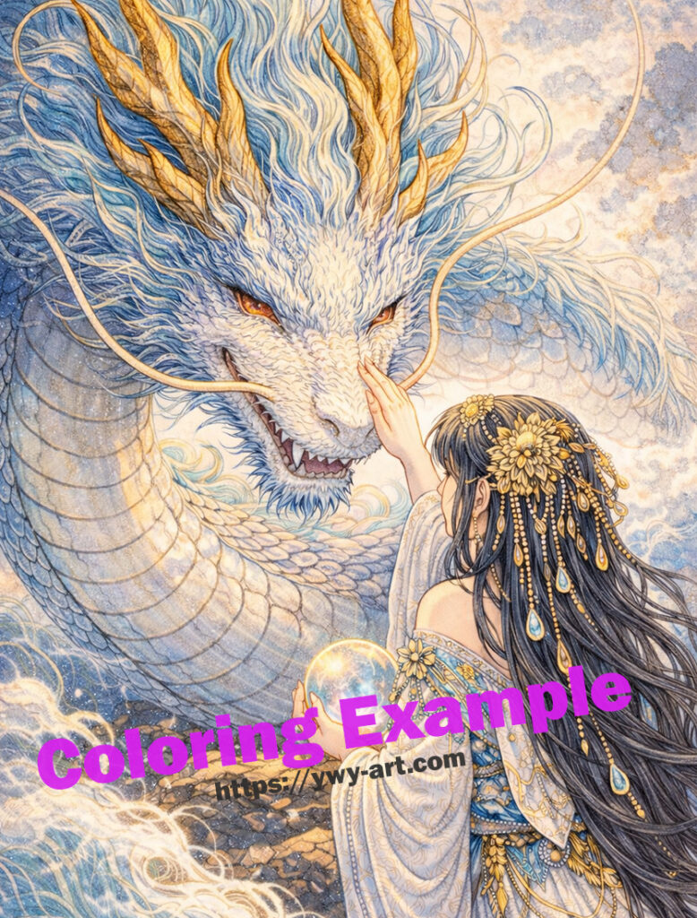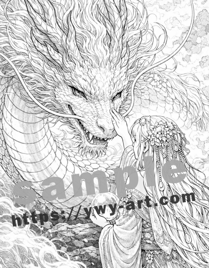 女性の手にある光の珠は、人と自然、そして神の世界を結ぶ象徴です。 龍の流れる髭や細かく重なる鱗、渦巻く波の表現は、 日本の伝統的な神話や美術の雰囲気を取り入れた構成になっています。
