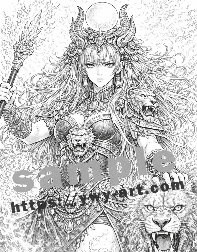 炎の中に立つ女神と獅子の姿は、力強くドラマチックな塗り絵体験を生み出します。