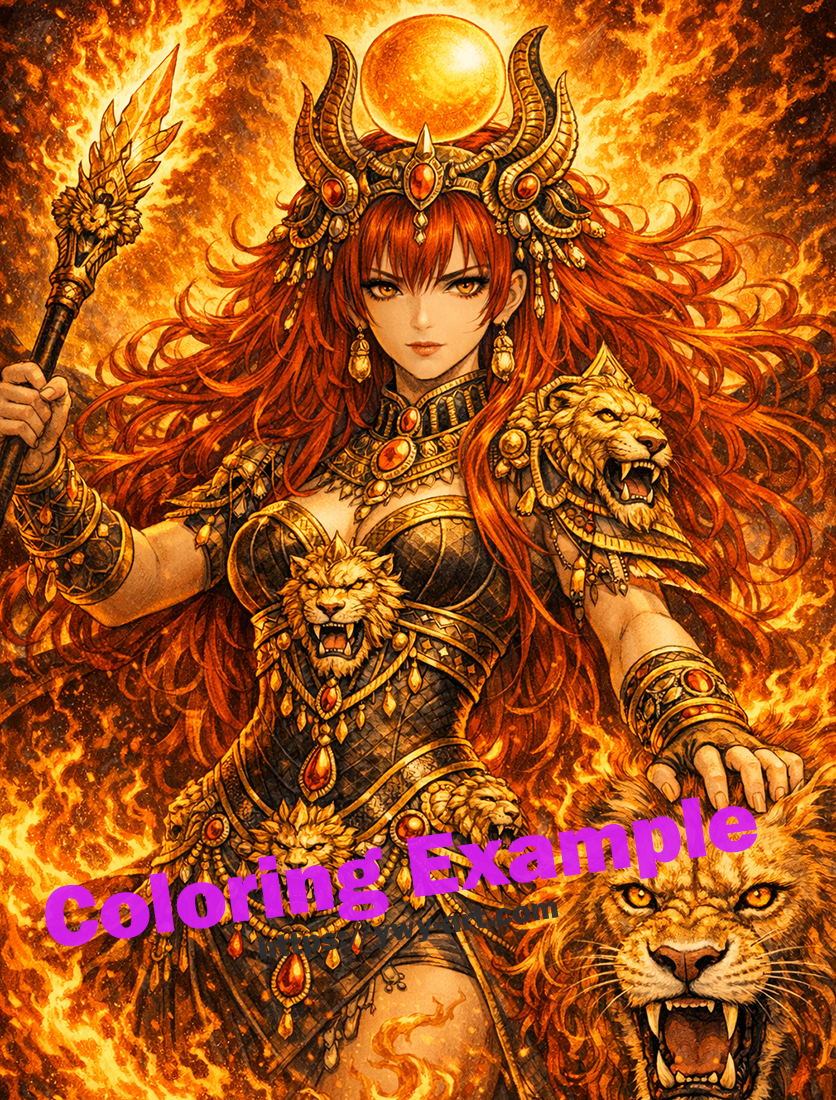 At her side stands a powerful lion — not merely a companion, but an extension of her divine nature. Together they embody the unstoppable force of the sun’s wrath.