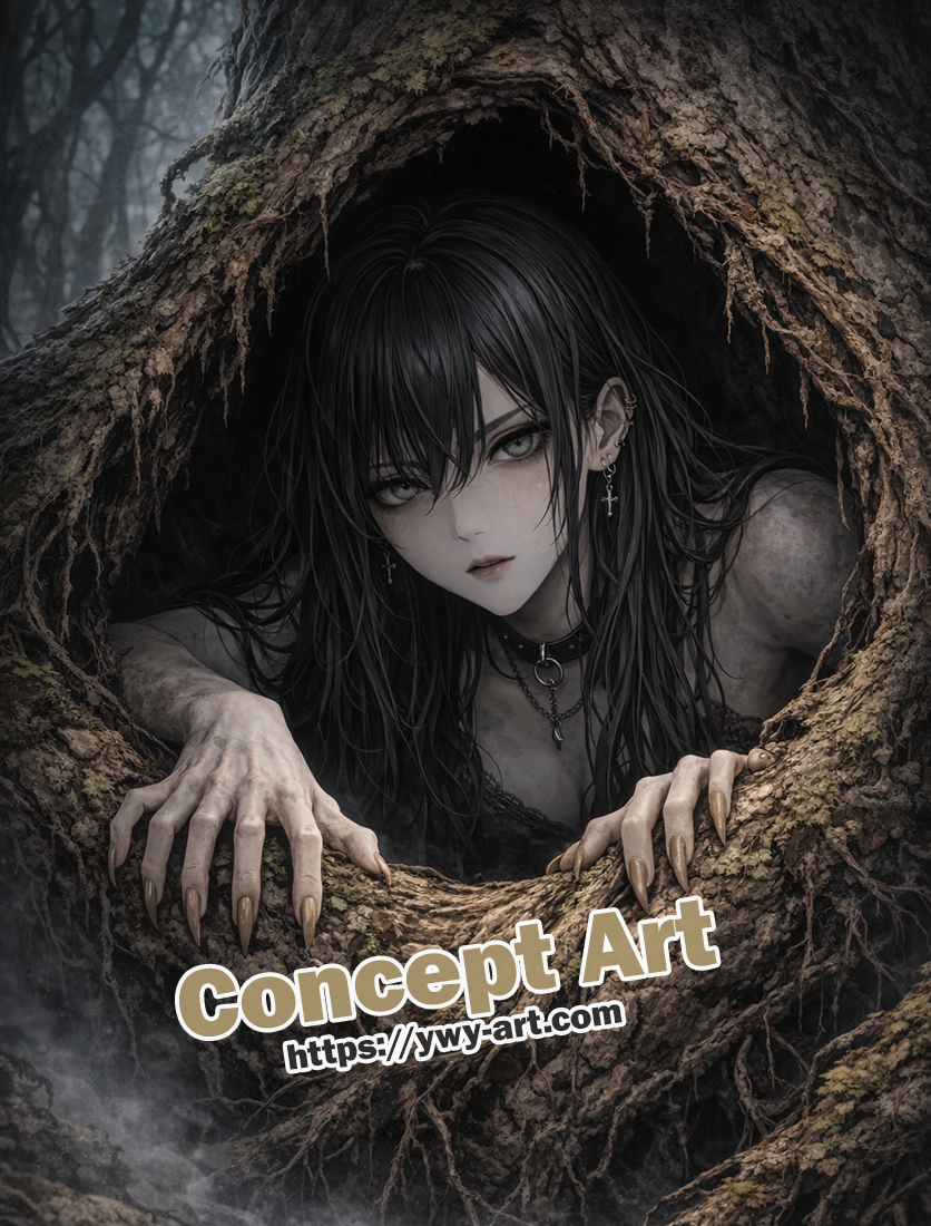 Visual Keywordstree hollow, claws, pale skin, dark hair, shadows