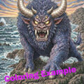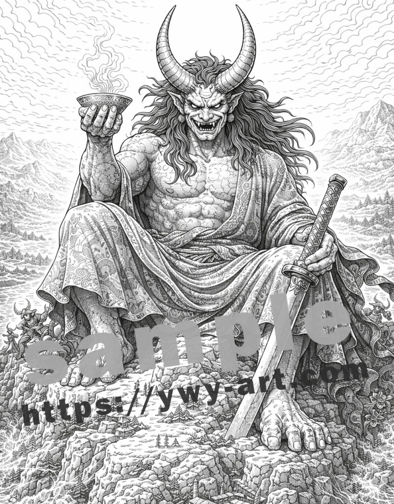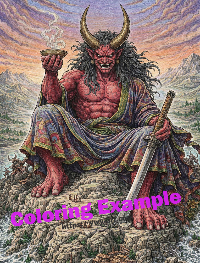 His massive horns, muscular body, and flowing hair create a strong and iconic silhouette. Subtle Japanese-style patterns appear on his skin and garments, adding depth and visual interest while preserving open spaces for coloring.