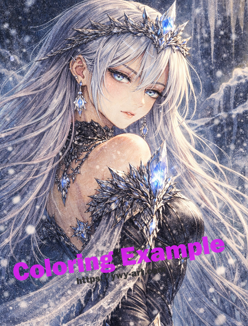 Whites, grays, icy blues, and muted silver tones emphasize the winter setting.