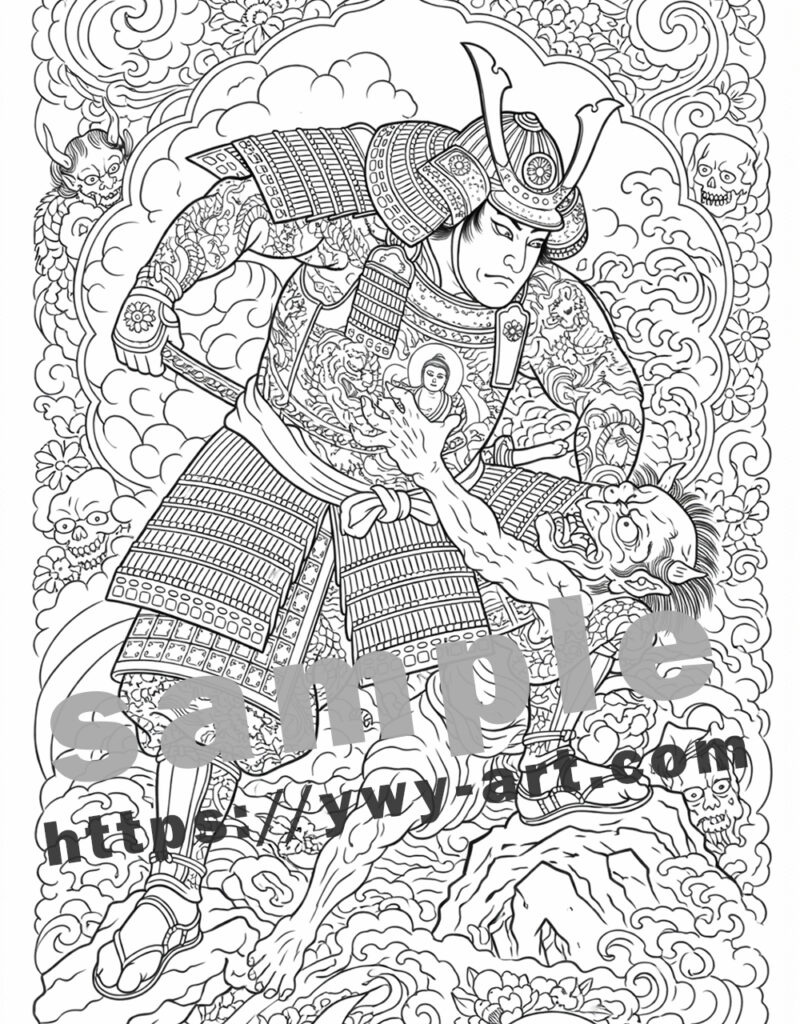 構図は浮世絵や和彫りの影響を受け、流れるような動きと安定したバランスを両立しています。一本一本の線が緊張感と美しさを生み出し、塗り絵としても没入感の高い仕上がりとなっています。
