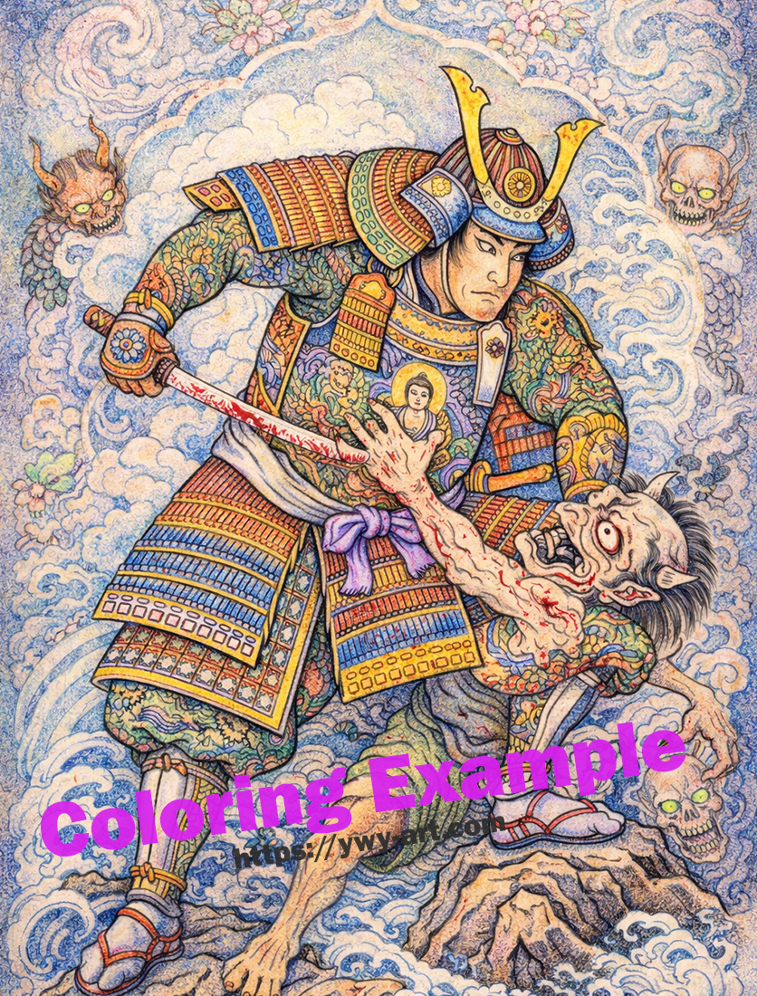 本作は、そんな侍が超常の存在と対峙する瞬間を描いています。刀を構え、一歩も引かない姿は、揺るがぬ覚悟と精神力を象徴しています。精緻に描かれた甲冑は、単なる防具ではなく、その人物の歴史や誇りを表しています。